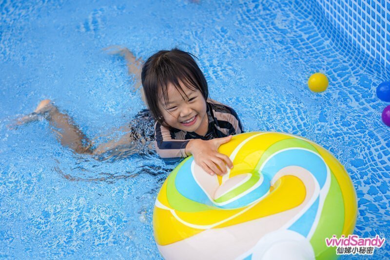 宜蘭 貝可妮 親子民宿能夠成功把 Lucie 從房間裡的溜滑梯騙出來就是跟她說要去樓下玩水,這個戲水池雖然沒有很大,但就足夠讓小小孩在裡面玩到一樣帶不走了,這個戲水池平常是包棟才能使用,我們有點幸運因為前一天剛好有人包棟,所以民宿老闆有多讓我們玩一下下才收。