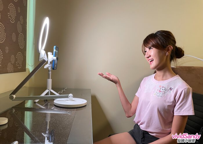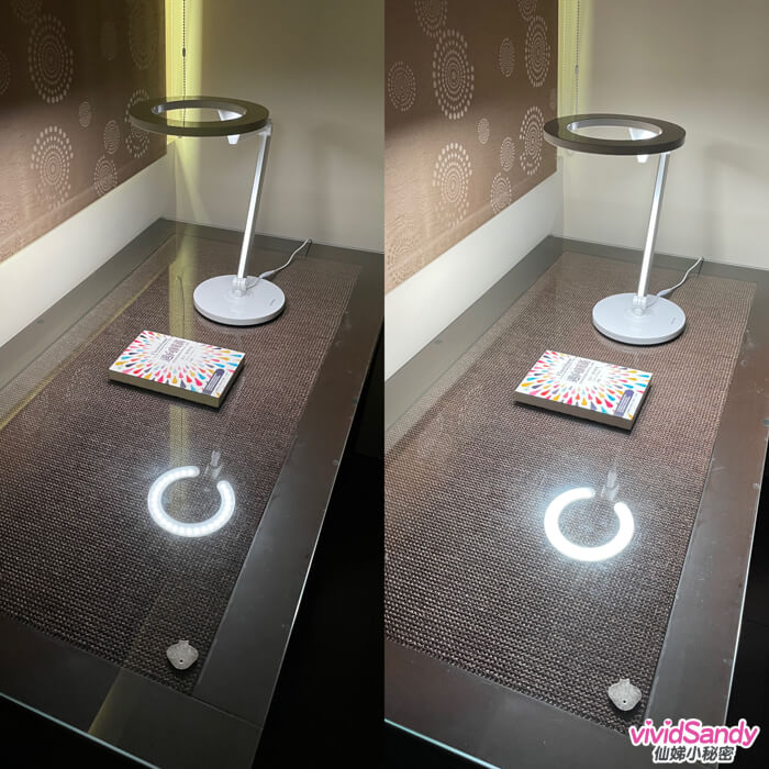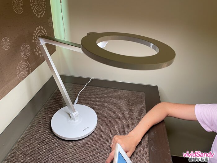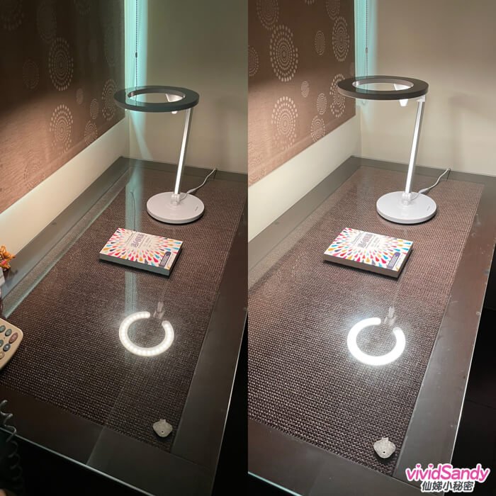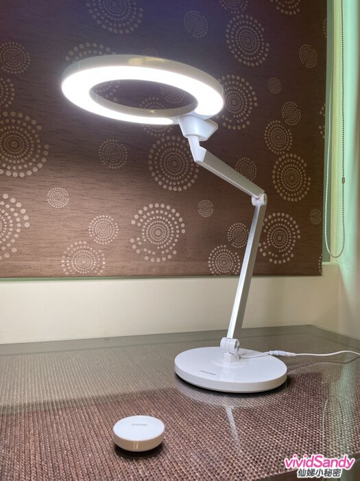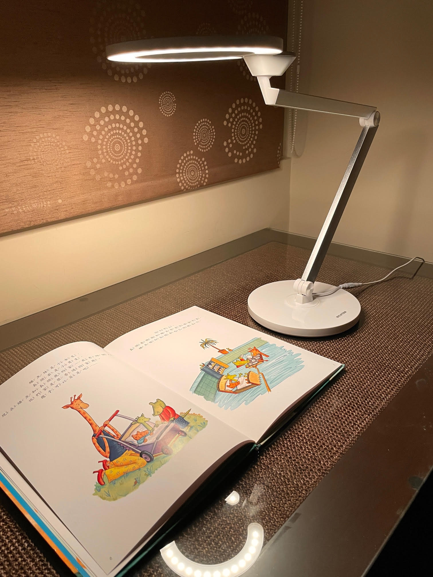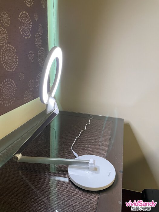 12. 一燈多用,變身環形補光燈檯燈最重要的就是光線要均勻,這是我將白光開到最亮的樣子,整張桌子的光線很平均,而我房間內的燈只開一半,這樣更看得出檯燈的範圍。此護眼檯燈的光線是有五種色溫的,可依需求調整,所以這樣一來看睡前故事就能夠有很充足的光線。