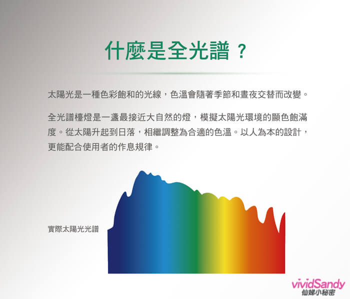 • 太陽光光譜又稱作全光譜,色溫隨著四季和早晚時間變化而改變。