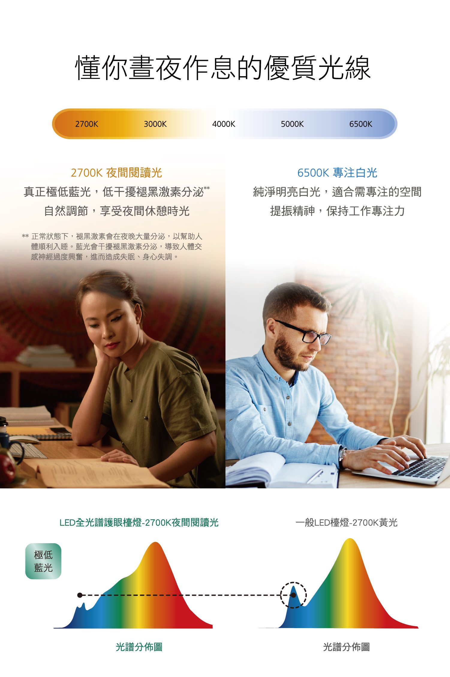 6500K 專注⽩光、5000K 閱讀⽩光、4000K 舒適⾃然光、3000K 休閒⿈光、2700K 夜間閱讀光